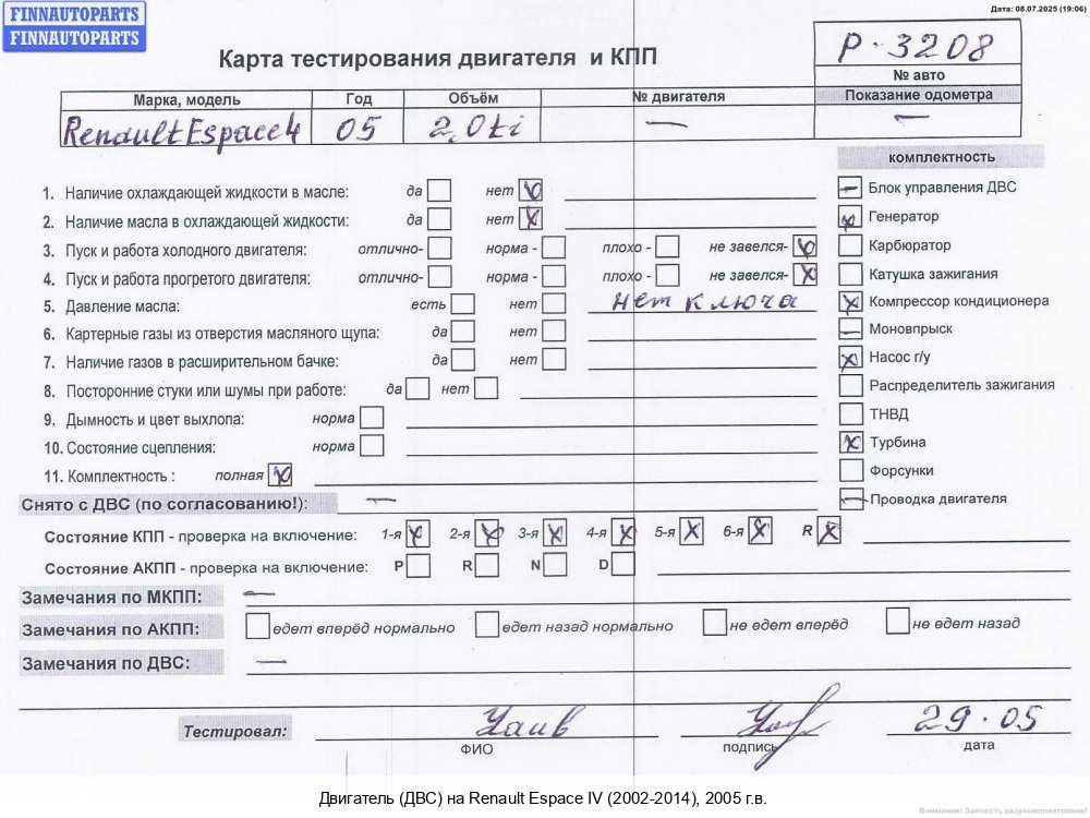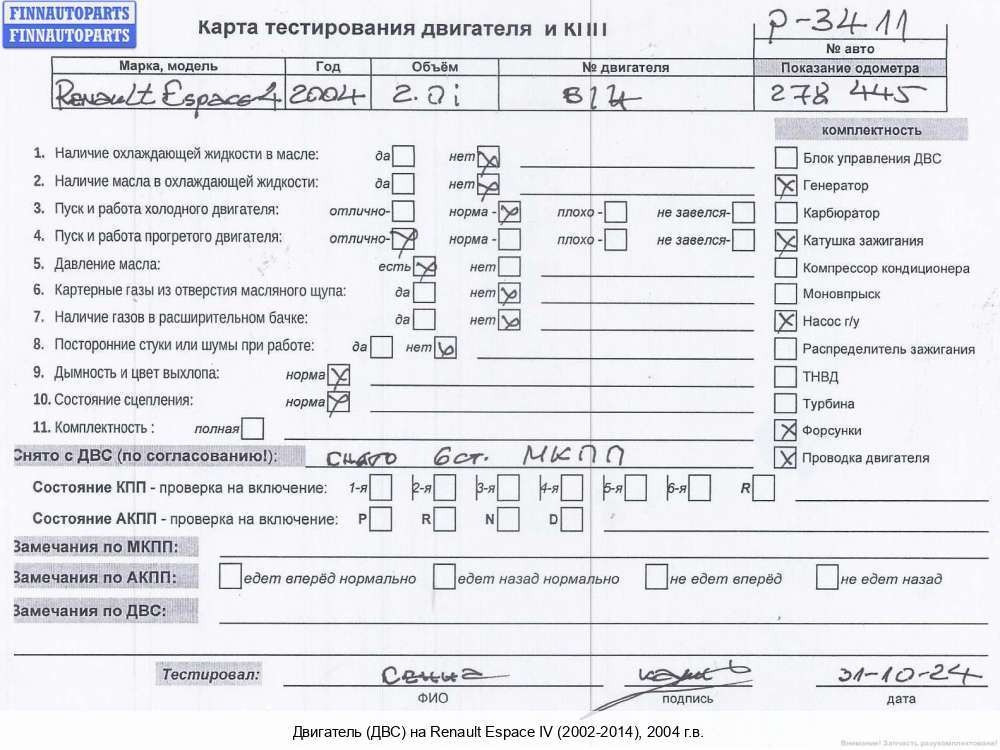 Екатеринбург | 2004 | 7701477493, 7701477498, 2004, 3л, Дизель, DCI, P9X 701, P9XA701W046465, 7701477493 0 / 7701477498, Минивэн, синий, P9XA701W046465 | - | Г | К | Н | КК | ТУ, состояние ГРМ - нормально, поддон - нормально, прокручивается, клапанная крышка - нормально, эмульсия - нет, | |||
